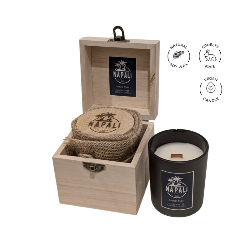 • Every candle comes with a Nā Pali logo embroidered wooden gift box