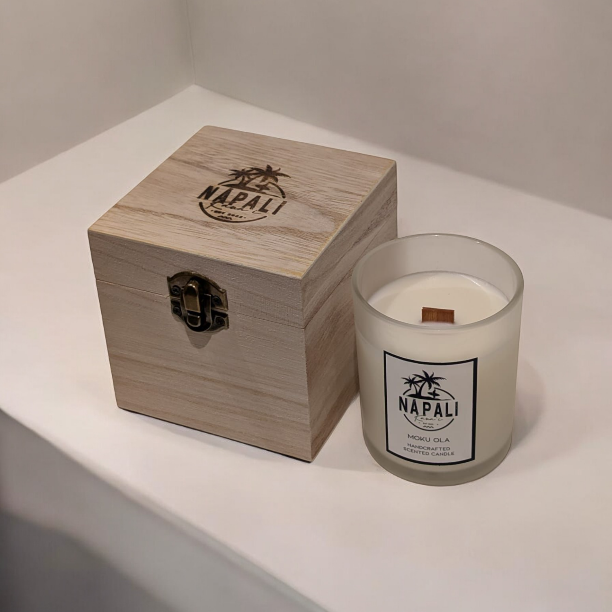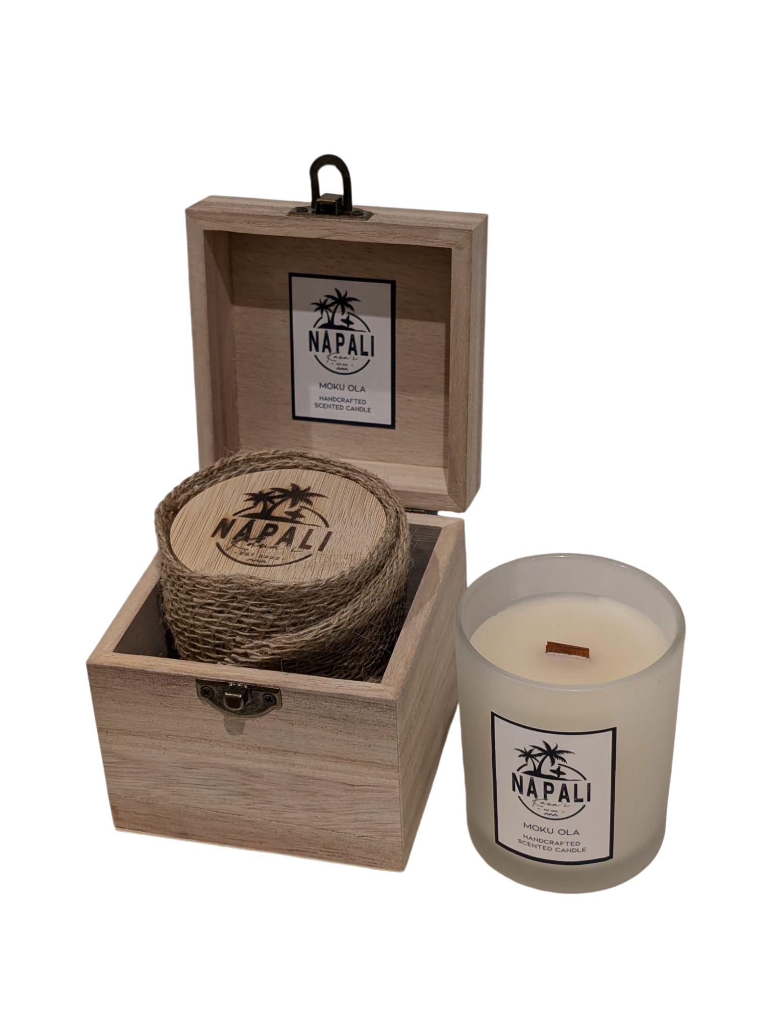 • Every candle comes with a Nā Pali logo embroidered wooden gift box
