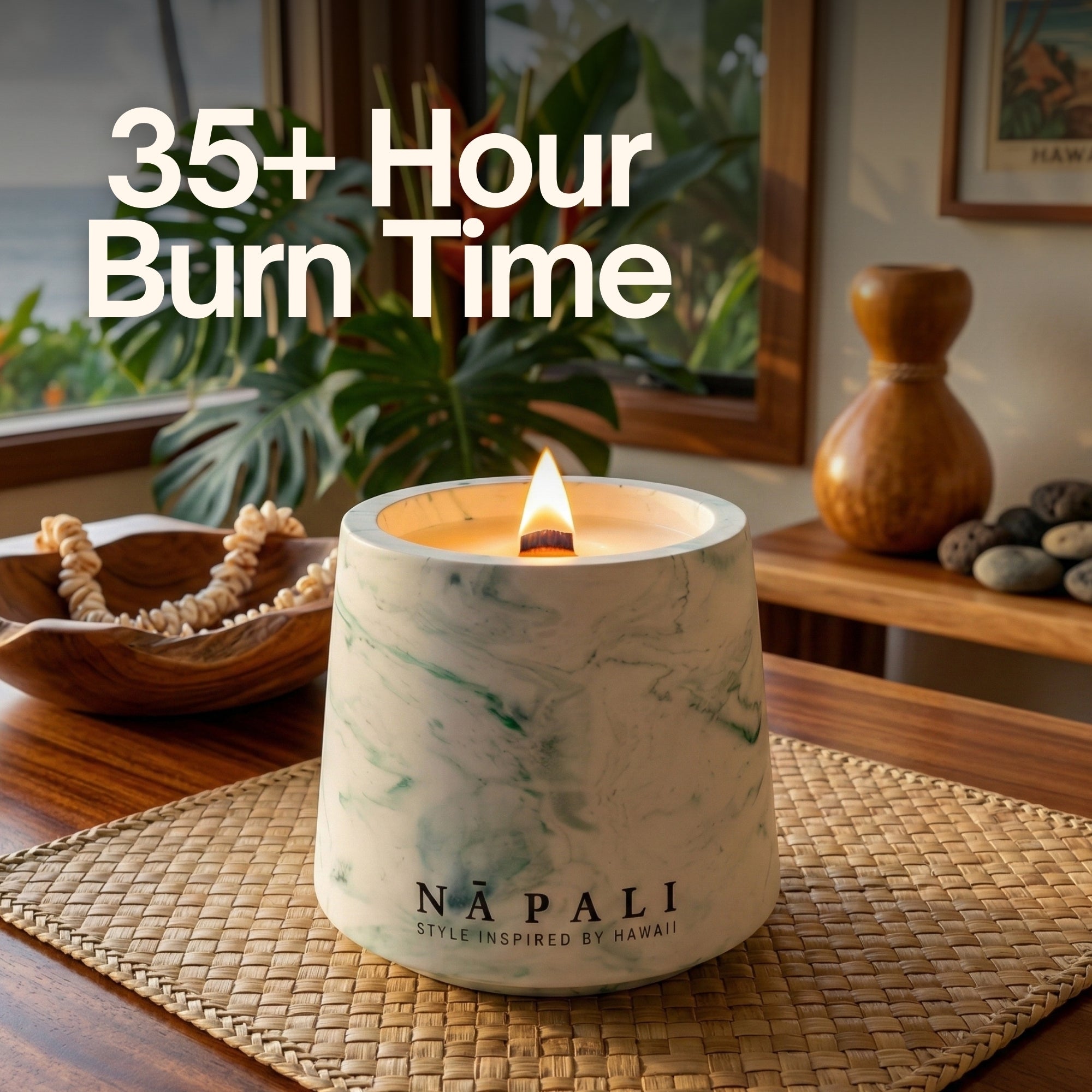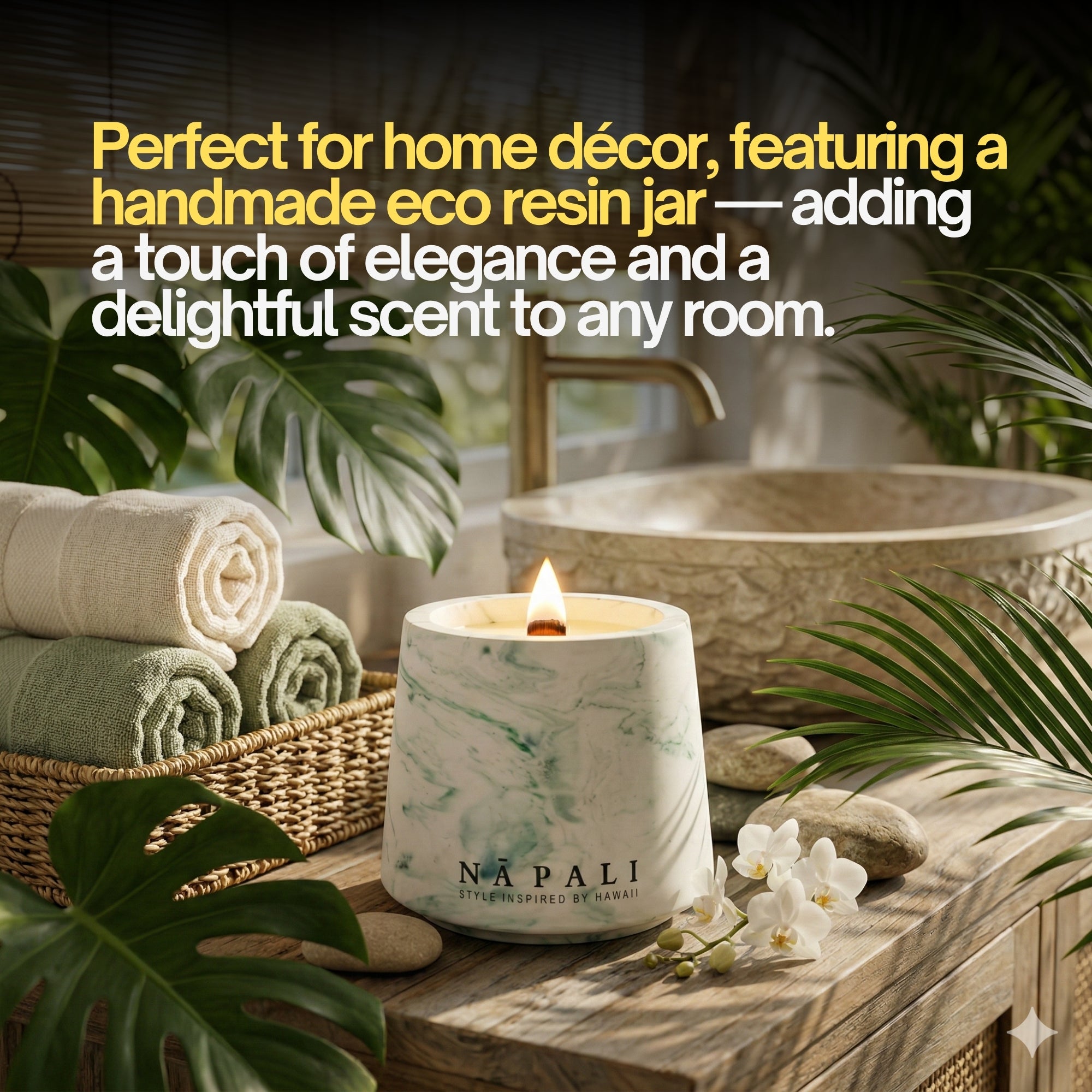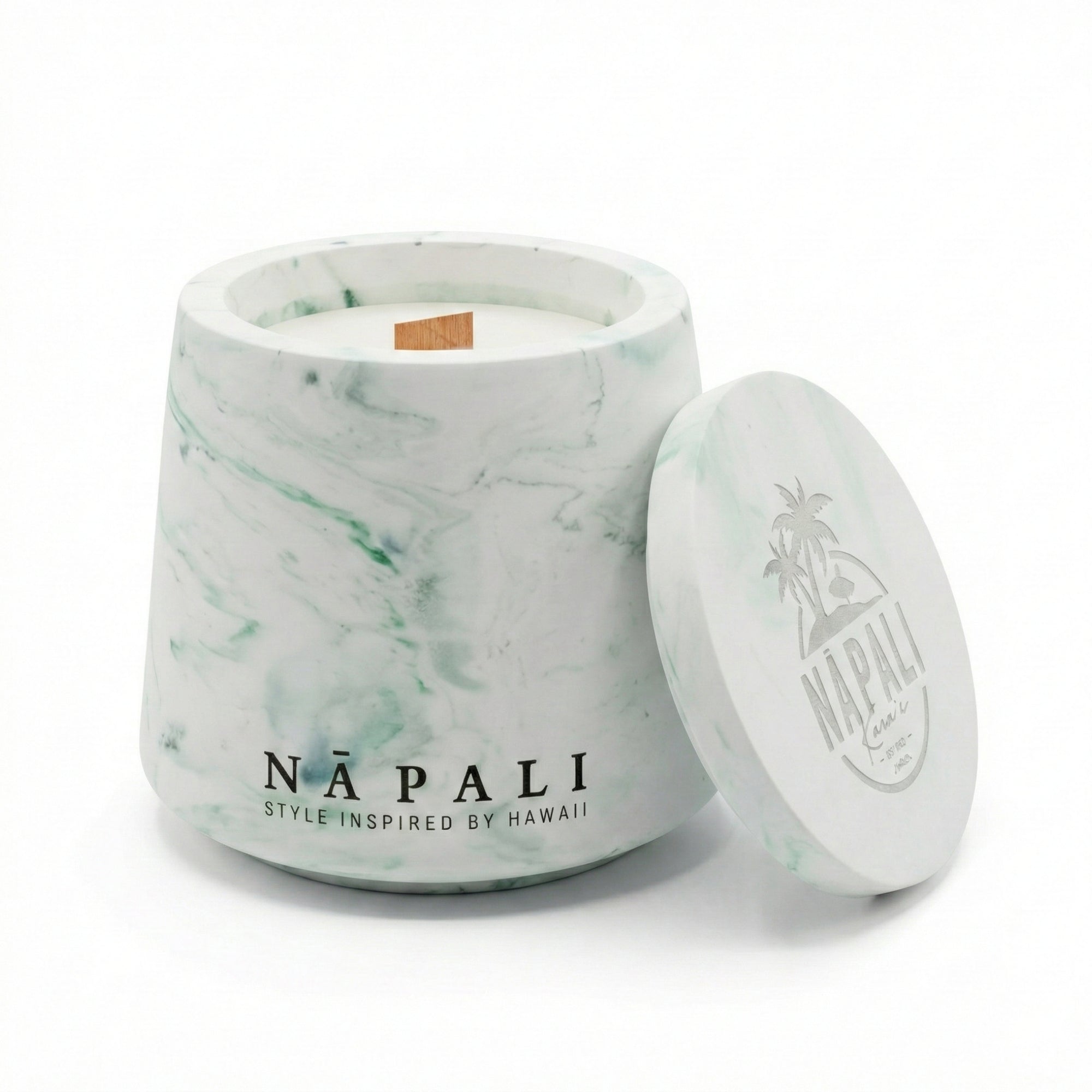 Each candle is housed in a handcrafted eco-resin jar with a lush green marble finish—bringing both elegance and a touch of nature to your space. Part of the Na Pali Stone Collection, designed to capture the textures, colours, and spirit of the islands.