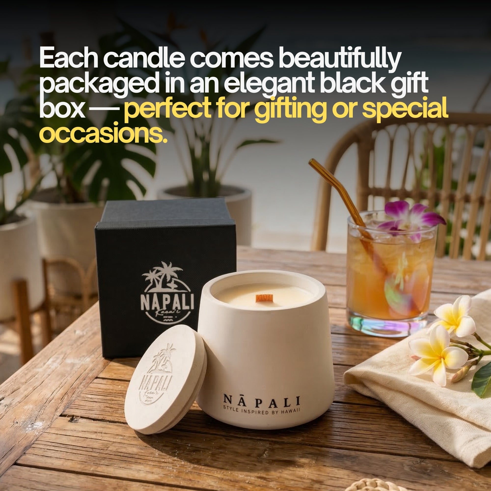 Each candle is housed in a handcrafted eco-resin jar with a natural finish, making it both a luxurious décor piece and a sensory experience. Part of the Na Pali Stone Collection, celebrating the textures and warmth of nature.
