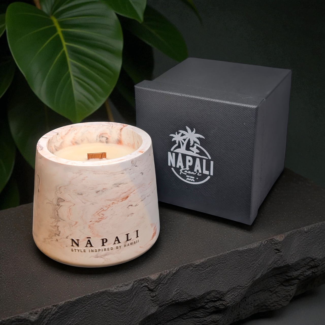 Each candle is housed in a handcrafted eco-resin jar with an amber marble finish, reflecting the golden tones of autumn. A perfect balance of warmth and elegance, Autumn Aloha is part of the Na Pali Stone Collection, celebrating nature’s colours and textures.